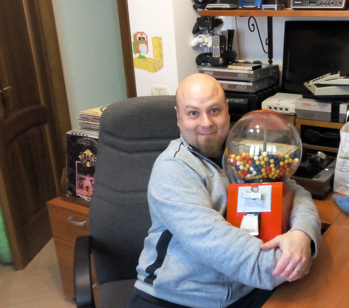 ANTONIO: La prima cosa che mi viene in mente è che è quasi sempre disordinato. Immaginate di avere finalmente tante di quelle piccole cose che desideravate da bambini e di volerle sempre a disposizione, un po’ per guardarle, un po’ per usarle. Ecco, il mio angolo videoludico è più o meno così… In continua trasformazione. Ho un po’ di console e computer collegati, già pronti all’uso, qualcuno in esposizione e poi, in base al periodo, un po’ di oggetti vintage che magari vado recuperando o che qualcuno mi ha regalato, come ad esempio un Telefono bigrigio S62 a rotella, una radio a valvole Radiomarelli, una Polaroid, un distributore di chewingum. Insomma “cose vecchie”.